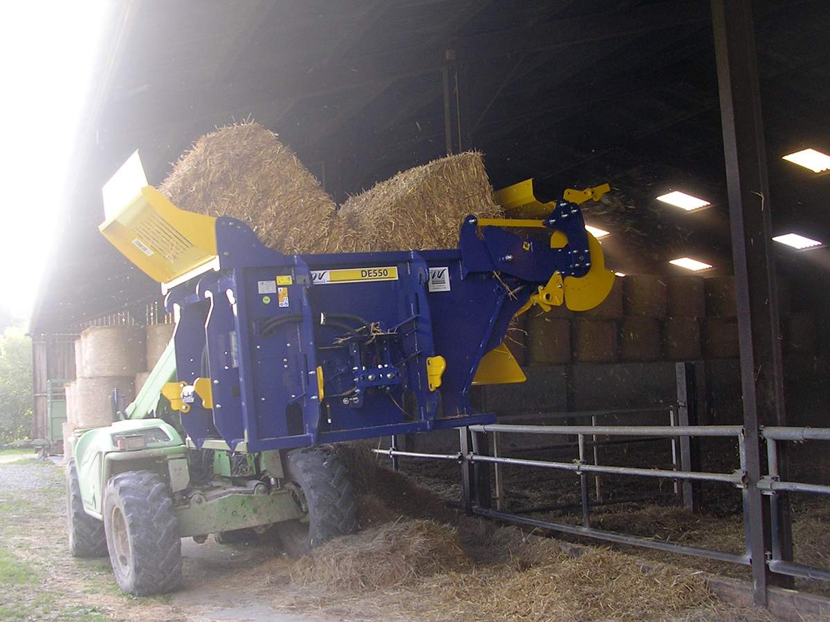 Le tablier pique-bottes avec accrochage automatique hydraulique permet de charger la balle et d'entrainer la machine. Une télécommande à distance permet de contrôler les différentes fonctions de la dérouleuse-pailleuse sans descendre du chargeur (vitesse d'avancement du tapis, distance de paillage, position du rotor).