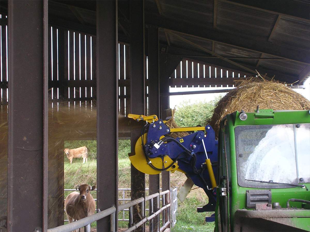 Equipée d'un accrochage à gauche et à droite, la dérouleuse-pailleuse peut être équipée d'un troisième côté, pour une distribution frontale.
