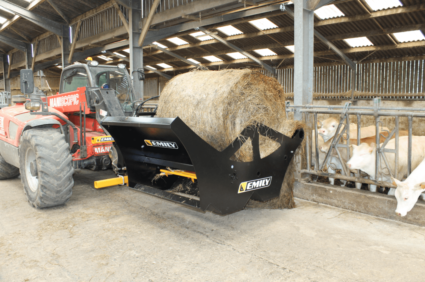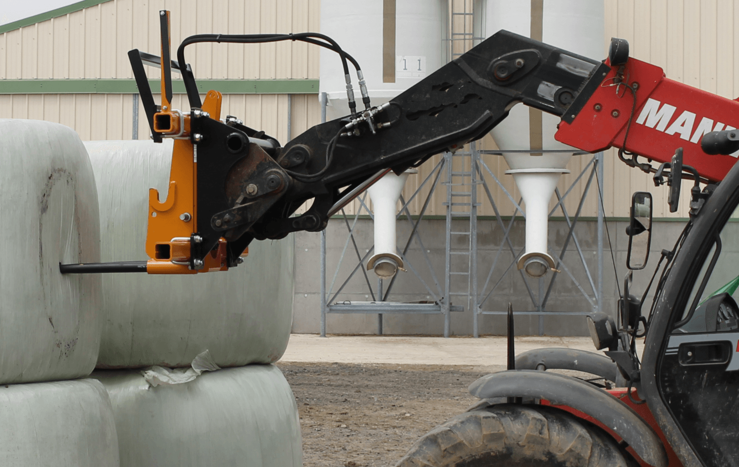 L’accrochage se fait par l’attelage de la dérouleuse. Les doigts du pique bottes s’insèrent sous la dérouleuse et lors du levage, le tablier d’accrochage vient saisir la dérouleuse.