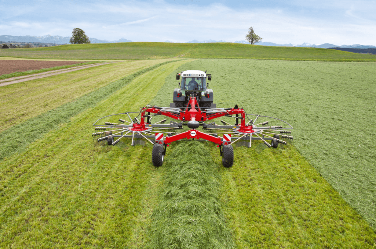 - Réglage hydraulique en continu des largeurs de travail et d'andainage avec échelle graduée pour lire la largeur de travail.