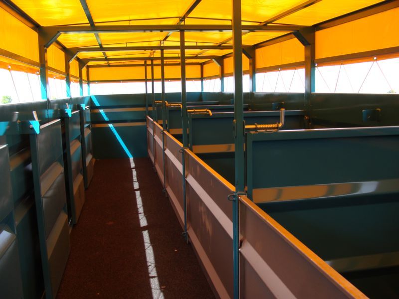 Modèle 10m Semi Porté porcs, longueur 10m, largeur intérieure 2m40, hauteur des côtés 140cm, balancier ROLLAND, PTAC 17T. Options à définir : types de portillon, résine, type de pont.