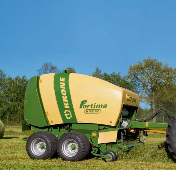 La presse à balles rondes Krone Fortima V 1500 MC permet de confectionner des balles rondes d'une largeur de 1.20 m et d’un diamètre allant de 1.00 de 1.50 m, avec un pick-up de 2.05 m de large. L'option MultiCut permet de couper le fourrage grâce à 17 couteaux.