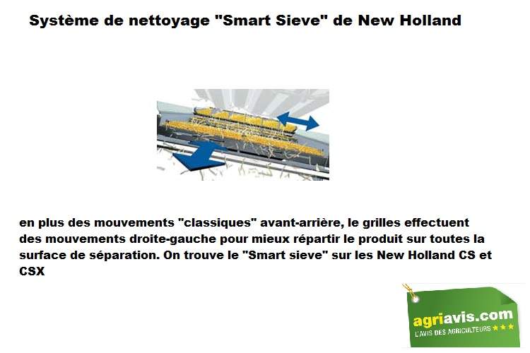 Côté séparation, la moissonneuse-batteuse New Holland CSX 7060 reçoit le système de nettoyage "Smart Sieve". Un vérin placé sur le côté du système de nettoyage donne un mouvement droite-gauche à la pré-grille (longueur de 45 cm) et à la grille supérieure pour mieux répartir le produit sur toute la surface.
