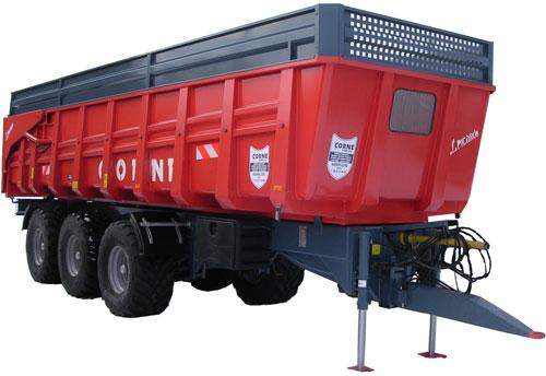 Caractéristiques de la remorque Corne monocoque 2 et 3 essieux: Châssis: Tubes rectangulaires à haute résistance de qualité E36.3. Bennage: Cardan - Compresseur 1000 trs agissant sur vérins à pression d'utilisation de 200 bars - (clapet parachute préréglé sur vérin) - Tuyauterie rigide. Caisse: Tôle 1er choix - traverses sous caisse rapprochées pour renforcer l'ossature - Ranchers soudés sur toute la hauteur du châssis tubulaire - Bandeau latéral de renfort de caisse sur BB 17 , BB18, BB21 et BB 23 - Soudure en continu - Porte automatique 2 battants avec 2 trappes à grains à levier - Echelle sur le côté et marchepied intérieur - Poulies pour sandow bâche. Bogie: Empattement important permettant la monte de roues de grand diamètre. Tandem: Sur BB21, (en option sur BB16, BB17 et BB18). Tridem: sur BB23 Signalisation: de type routière conforme au code de la route. Finition: peinture 2 couches apprêt anti-rouille et 2 couches laque polyuréthane. Options: Cage ensilage - Rehausse avant betteravière - Porte hydraulique - Hublot pléxis - Bâche.