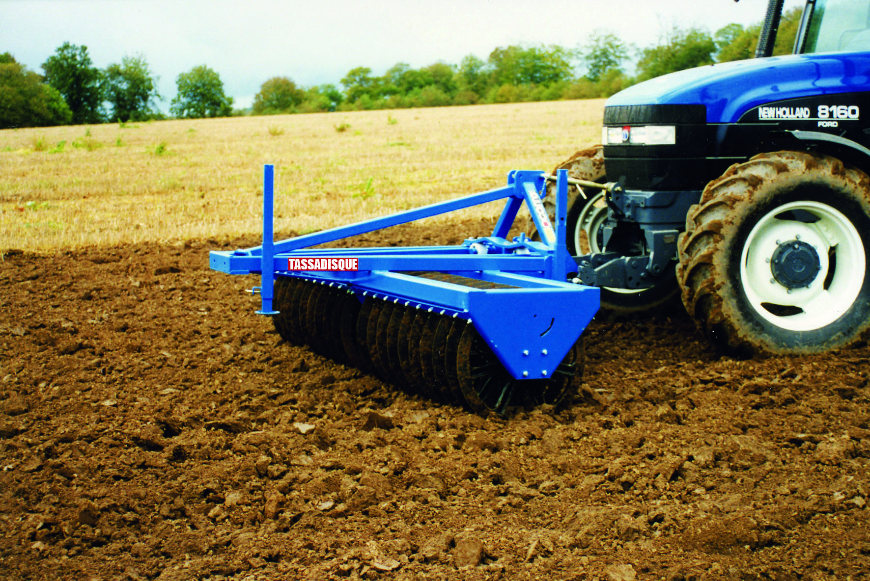 Tassadisque est un outil de 1,5 à 6m de large qui s'installe sur le relevage avant du tracteur.