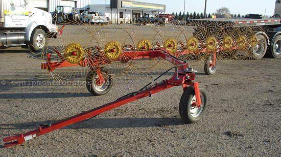 Le Tonutti T9 est un rateau andaineur à soleil de type Rémi, de 9 roues soleils en ligne avec suspension indépendante sur une poutre tractée montée sur 3 roues.