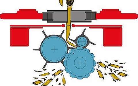 Avec le cueilleur à maïs Rotadisc de Geringhoff, deux rotors cueilleurs de diamètres différents prennent le maïs, le séparent de sa racine tout d'abord au moyen du diviseur de chaume qui se trouve sur la vis du rotor pour le tirer ensuite vers le bas. L'épi de maïs est égrené sur les plaques cueilleuses. Simultanément, le troisième rotor muni de disques à couteaux divise la tige du maïs en morceaux réguliers courts.