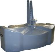 Les masses "Monobloc" de la société Euromasse sont composées d'une masse principale avec attelage à chape (par broches noyées dans la fonte) pour les bras de relevage pénétrant dans le bloc, et d'une potence en mécano soudée vissée dans des inserts pour le 3ème point.