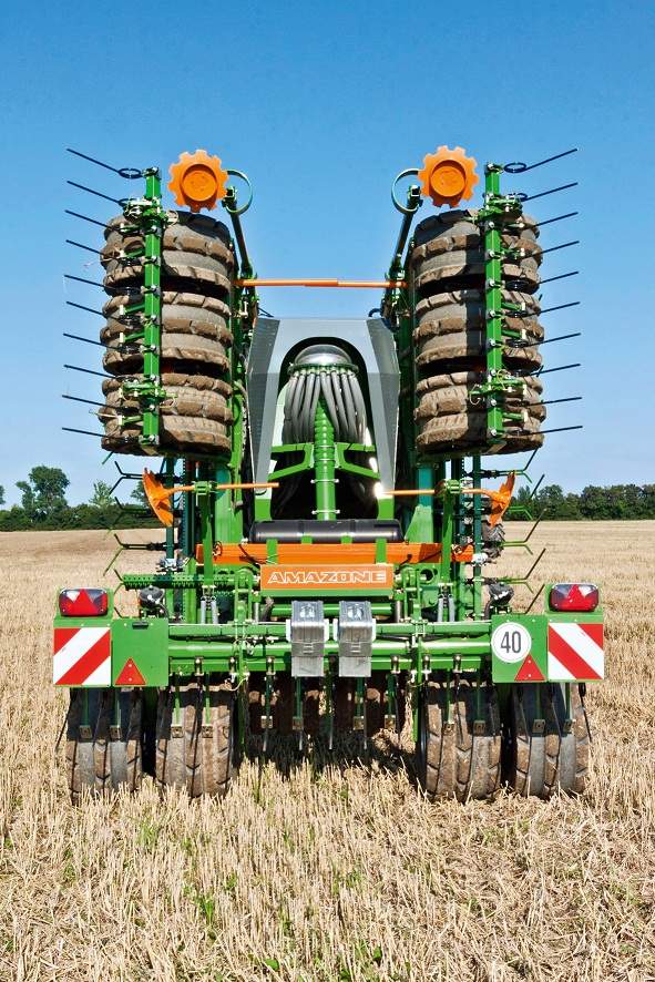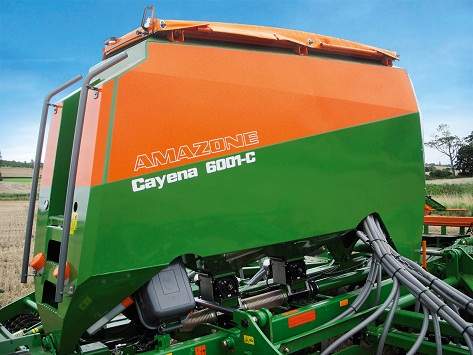 Sur le semoir à dents Amazone Cayena 6001-C, d’une largeur de semis de 6 m, la trémie de 4.000 litres est divisée en deux, proportionnellement 60% pour l’engrais et 40% pour la semence. La trémie est équipée de deux doseurs entièrement électriques. La semence et l’engrais sont appliqués simultanément sur le même passage dans le sillon.