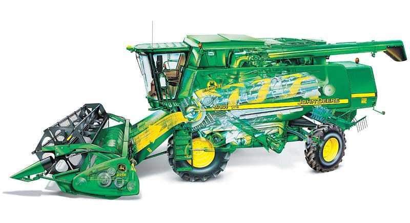 Le concept CTS (séparateurs longitudinaux à doigts) associe un batteur de grand diamètre (660 mm) au module de séparation à doigts. La motorisation plus puissante 355 ch ECE R24 apparue en 2005 accroît la capacité et lefficacité globale de la 9780i CTS. Le moteur fournit en outre une puissance additionnelle pour permettre de vider la trémie en marche sans affecter le rythme de travail. Le nouveau tambour de décharge arrière force le flux de matière limitant ainsi les risques de bourrage, même en présence de récoltes vertes ou humides. Le "i" apparu également en 2005 signifie que ces batteuses "intelligentes" peuvent recevoir les dispositifs "Autotrac" (guidage) et "HarvestSmart". Ce système règle l'avancement de la machine en fonction de la recherche de la productivité maximale ou des pertes acceptées. puissance : 355 ch Nombre de cylindre/ cylindrée : Deere 6/8100 cm3 capacité reservoir : 700 litres diamètre du batteur : 660 mm largeur batteur : 1400 mm nombre de rotors : 2 diamètre des rotors avant/arrière 464/ 502 mm: longueur des rotors : 3400 mm surface de nettoyage : Capacité trémie : 10000 litres vidange trémie : 88 litres/ seconde hauteur de transport : 3,94 m (Standard)/ 3,99 m 5Hillmaster) (en 800/65 R32) largeur transport : 3,5 m (800/65R32)