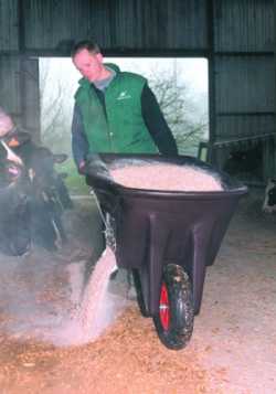 La brouette distributrice d’aliments de la firme « La Buvette » est munie d'une large ouverture de 300mm x 88mm. Une trappe actionnée par la poignée droite du brancard vient l'obturer. 3 indexages permettent à l'éleveur de régler l'écoulement en fonction de son allure. Le débit est donc réglable de 0 à 100 kg/min.
